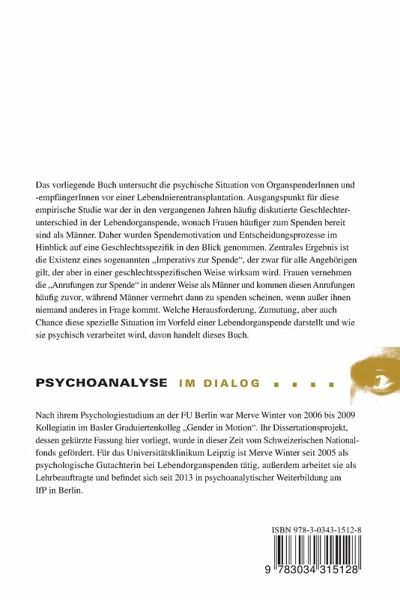 Das vorliegende Buch untersucht die psychische Situation von OrganspenderInnen und -empfängerInnen vor einer Lebendnierentransplantation. Ausgangspunkt für diese empirische Studie war der in den vergangenen Jahren häufig diskutierte Geschlechterunterschied in der Lebendorganspende, wonach Frauen häufiger zum Spenden bereit sind als Männer. Daher wurden Spendemotivationen und Entscheidungsprozesse im Hinblick auf eine Geschlechtsspezifik in den Blick genommen. Zentrales Ergebnis ist die Existenz eines so genannten "Imperativs zur Spende", der zwar für alle Angehörigen gilt, der aber in einer geschlechtsspezifischen Weise wirksam wird. Frauen vernehmen die "Anrufungen zur Spende" in anderer Weise als Männer und kommen diesen Anrufungen an sie häufig zuvor, während Männer vermehrt dann zu spenden scheinen, wenn außer ihnen niemand anderes in Frage kommt. Welche Herausforderung, Zumutung, aber auch Chance diese spezielle Situation im Vorfeld einer Lebendorganspende darstellt und wie sie psychisch verarbeitet wird, davon handelt dieses Buch.
