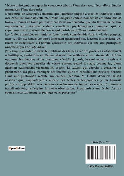 " Notre précédent ouvrage a été consacré à décrire l'âme des races. Nous allons étudier maintenant l'âme des foules. L'ensemble de caractères communs que l'hérédité impose à tous les individus d'une race constitue l'âme de cette race. Mais lorsqu'un certain nombre de ces individus se trouvent réunis en foule pour agir, l'observation démontre que, du fait même de leur rapprochement, résultent certains caractères psychologiques nouveaux qui se superposent aux caractères de race, et qui parfois en diffèrent profondément. Les foules organisées ont toujours joué un rôle considérable dans la vie des peuples; mais ce rôle n'a jamais été aussi important qu'aujourd'hui. L'action inconsciente des foules se substituant à l'activité consciente des individus est une des principales caractéristiques de l'âge actuel. J'ai essayé d'aborder le difficile problème des foules avec des procédés exclusivement scientifiques, c'est-à-dire en tâchant d'avoir une méthode et en laissant de côté les opinions, les théories et les doctrines. C'est là, je crois, le seul moyen d'arriver à découvrir quelques parcelles de vérité, surtout quand il s'agit, comme ici, d'une question passionnant vivement les esprits. Le savant, qui cherche à constater un phénomène, n'a pas à s'occuper des intérêts que ses constatations peuvent heurter. Dans une publication récente, un éminent penseur, M. Goblet d'Alviela, faisait observer que, n'appartenant à aucune des écoles contemporaines, je me trouvais parfois en opposition avec certaines conclusions de toutes ces écoles. Ce nouveau travail méritera, je l'espère, la même observation. Appartenir à une école, c'est en épouser nécessairement les préjugés et les partis pris."