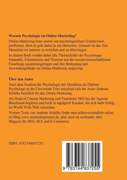 Online-Marketing kann enorm von psychologischem Grundwissen profitieren, denn es geht dabei ja um Menschen. Genauer ist das Ziel, Menschen im Internet zu erreichen und zu überzeugen.In diesem Buch werden daher alle Themenfelder der Psychologie behandelt, Erkenntnisse und Theorien aus der sozialwissenschaftlichen Forschung zusammengetragen und ihre Bedeutung und Anwendungsfelder im Online-Marketing aufgezeigt.