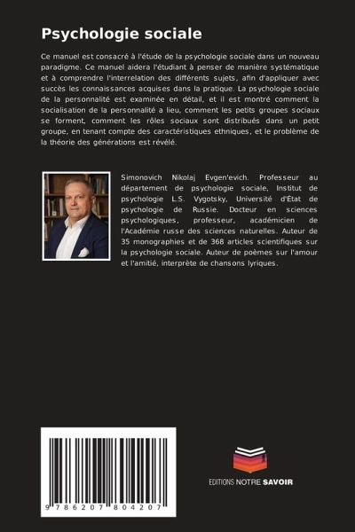 Ce manuel est consacré à l'étude de la psychologie sociale dans un nouveau paradigme. Ce manuel aidera l'étudiant à penser de manière systématique et à comprendre l'interrelation des différents sujets, afin d'appliquer avec succès les connaissances acquises dans la pratique. La psychologie sociale de la personnalité est examinée en détail, et il est montré comment la socialisation de la personnalité a lieu, comment les petits groupes sociaux se forment, comment les rôles sociaux sont distribués dans un petit groupe, en tenant compte des caractéristiques ethniques, et le problème de la théorie des générations est révélé.