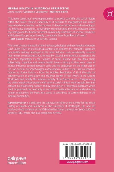 This book situates the work of the Soviet psychologist and neurologist Alexander Luria (1902-1977) in its historical context and explores the 'romantic' approach to scientific writing developed in his case histories. Luria consistently asserted that human consciousness was formed by cultural and historical experience. He described psychology as the 'science of social history' and his ideas about subjectivity, cognition and mental health have a history of their own. Lines of mutual influence existed between Luria and his colleagues on the other side of the iron curtain, but Psychologies in Revolution also discusses Luria's research in relation to Soviet history - from the October Revolution of 1917 through the collectivisation of agriculture and Stalinist purges of the 1930s to the Second World War and, finally, the relative stability of the Brezhnev era - foregrounding the often marginalised people with whom Luria's clinical work brought him into contact. By historicising science and by focusing on a theoretical approach which itself emphasised the centrality of social and political factors for understanding human subjectivity, the book also seeks to contribute to current debates in the medical humanities.