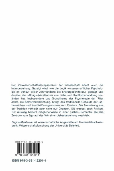Der Verwissenschaftlichungsprozeß der Gesellschaft erfaßt auch die Intimbeziehung. Gezeigt wird, wie die Logik wissenschaftlicher Psychologie im Verlauf dreier Jahrhunderte die Eheratgeberliteratur geprägt und darüber das (Alltags-)Verständnis von Liebe und Konfliktbehandlung verändert hat. Insbesondere das Grundthema der Psychologie der 70er Jahre: die Selbstverwirklichung bringt das traditonelle Gebäude der Liebeszeichen und Konfiktlösungsnormen zum Einsturz. Die Freisetzung aus der Tradition verheißt aber nichtnur Chancen. Sie erzeugt auch Risiken. Der Ausweg kann vielleicht in einer (Liebes-)Semantik bestehen, die das Zentrum vom Ego auf das Wir einer Liebesbeziehung verschiebt.