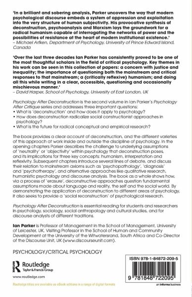 This book reviews the significance of deconstruction for a new generation of psychologists, and shows how deconstructive approaches question underlying assumptions in psychology about language and reality, the self and the social world.