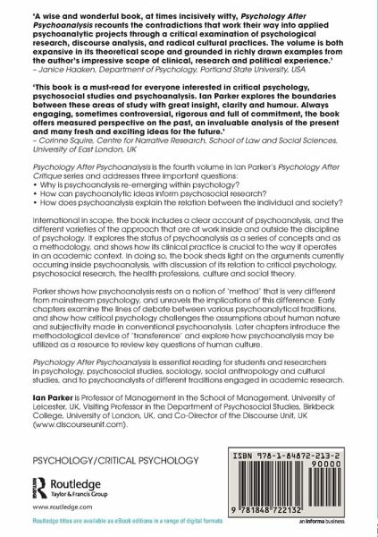 Ian Parker has been a leading light in the fields of critical and discursive psychology for over 25 years. The Psychology After Critique series brings together for the first time his most important papers. Each volume in the series has been prepared by Ian Parker and presents a newly written introduction and focused overview of a key topic area. Psychology After Psychoanalysis, the fourth volume in the series, is about the impact of psychoanalysis on critical debates in psychology. It addresses three central questions: Why is psychoanalysis re-emerging within psychology? How can psychoanalytic ideas inform psychosocial research? How does psychoanalysis explain the relation between the individual and society? International in scope, the book includes a clear account of psychoanalysis, and the different varieties of the approach that are at work inside and outside the discipline of psychology. It explores the status of psychoanalysis as a series of concepts and as a methodology, and shows how its clinical practice is crucial to the way that it operates now in an academic context. In doing so, the book sheds light on the arguments currently occurring inside psychoanalysis, with discussion of its relation to critical psychology, psychosocial research, the health professions, culture and social theory. Parker shows how psychoanalysis rests on a notion of 'method' that is very different from mainstream psychology, and unravels the implications of this difference. Early chapters examine the lines of debate between various psychoanalytical traditions, and show how critical psychology challenges the assumptions about human nature and subjectivity made in conventional psychoanalysis. Later chapters introduce the methodological device of 'transference' and explore how psychoanalysis may be utilized as a resource to review key questions of human culture. Psychology After Psychoanalysis is essential reading for students and researchers in psychology, psychosocial studies, sociology, social anthropology and cultural studies, and to psychoanalysts of different traditions engaged in academic research.