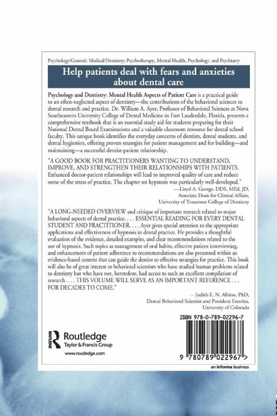 Psychology and Dentistry: Mental Health Aspects of Patient Care is a practical guide to an often-neglected aspect of dentistry-the contributions of the behavioral sciences to dental research and practice. Dr. William A. Ayer, Professor of Behavioral Sciences at Nova Southeastern University College of Dental Medicine in Fort Lauderdale, Florida, presents a comprehensive textbook that's an essential study aid for students preparing for their National Dental Board Examinations and a valuable classroom resource for dental school faculty. This unique book identifies the everyday concerns of dentists, dental students, and dental hygienists, offering proven strategies for patient management and for buildingand maintaininga successful dentist-patient relationship.