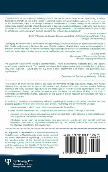 This book will present the arguement that psychologists have much to offer to the goal of stemming environmental change by reviewing the evidence on the prob of environmental deterioration as well as hum behavior's contribution to the problem.