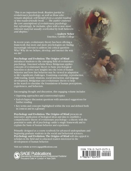 Psychology and Evolution: The Origins of Mind introduces students to the emerging field of evolutionary psychology. Bruce Bridgeman applies concepts of evolutionary theory to basic psychological functions to derive new insights into the roots of human behavior and how that behavior may be viewed as adaptation to life's significant challenges. Examining courtship, reproduction, child rearing, family relations, social interaction, and language development, Bridgeman uses evolutionary theory to help in the search to elucidate the foundations of human perceptions, experiences, and behaviors.