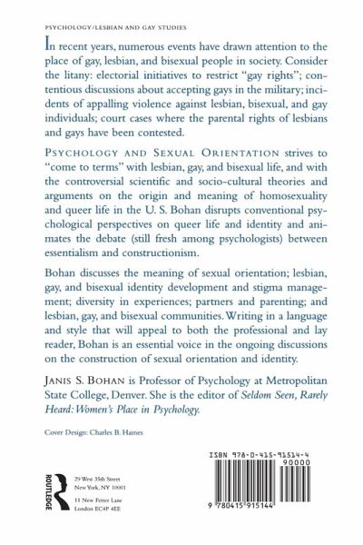 Psychology and Sexual Orientation strives to "come to terms" with lesbian, gay and bisexual life and with the controversial scientific and sociocultural theories and arguments on the origin and meaning of homosexuality and queer life in the US. Janis M. Bohan disrupts conventional psychological perspectives on queer life and identity and animates the ongoing debate between essentialism and constructionism. Bohan discusses the meaning of sexual orientation; lesbian, gay and bisexual identity development and stigma management; diversity in experiences; partners and parenting; and lesbian, gay and bisexual communities.