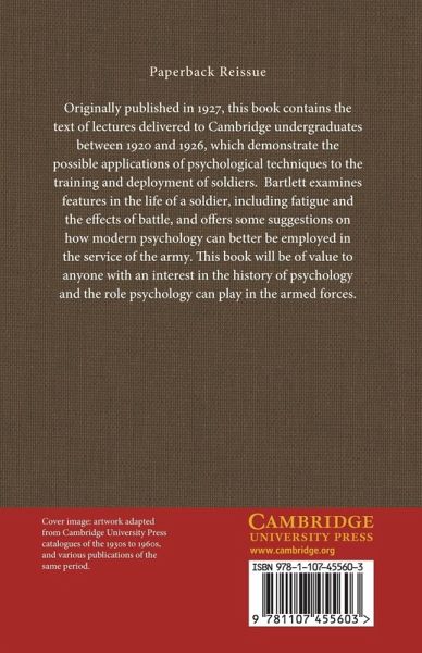 Originally published in 1927, this book contains the text of lectures delivered to Cambridge undergraduates between 1920 and 1926, which demonstrate the possible applications of psychological techniques to the training and deployment of soldiers. Bartlett examines features in the life of a soldier, including fatigue and the effects of battle, and offers some suggestions on how modern psychology can better be employed in the service of the army. This book will be of value to anyone with an interest in the history of psychology and the role psychology can play in the armed forces.