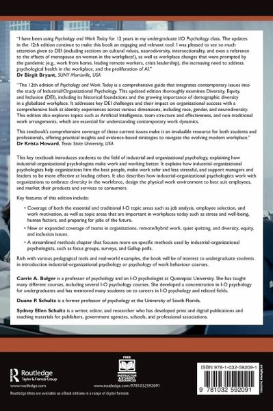 Carrie A. Bulger is a professor of psychology and an I-O psychologist at Quinnipiac University. She has taught many different courses, including several I-O psychology courses. She developed a concentration in I-O psychology for undergraduates and has mentored many students on to careers in I-O psychology and related fields. Duane P. Schultz is a former professor of psychology at the University of South Florida. Sydney Ellen Schultz is a writer, editor, and researcher who has developed print and digital publications and teaching materials for publishers, government agencies, schools, and professional associations.