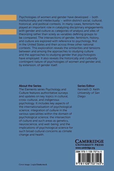 Psychologies of women and gender have developed - both institutionally and intellectually - within distinct social, cultural, historical, and political contexts. The intersections of gender, feminism, history, and culture are explored with reference to psychology, first in the United States, and then across three other national contexts.