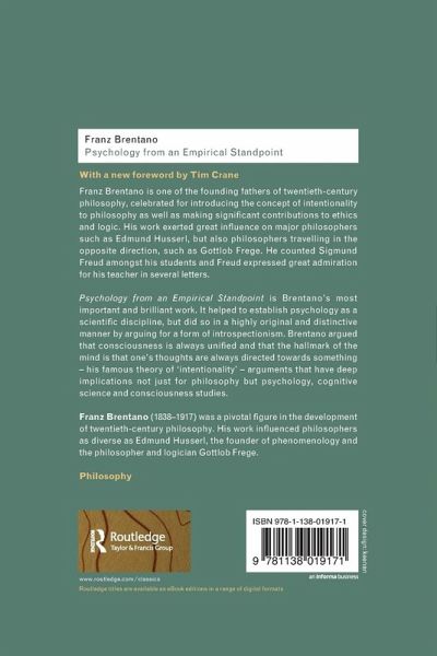 Psychology from an Empirical Standpoint is Brentano's most important and brilliant work. It helped to establish psychology as a scientific discipline, but did so in a highly original and distinctive manner by arguing for a form of introspectionism. Brentano argued that consciousness is always unified and that the hallmark of the mind is that one's thoughts are always directed towards something - his famous theory of 'intentionality' - arguments that have deep implications not just for philosophy but psychology, cognitive science and consciousness studies.