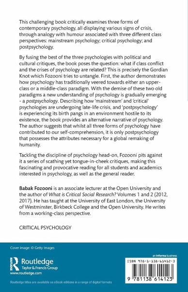 This challenging book critically examines three forms of contemporary psychology, all displaying various signs of crisis, through analogy with humour associated with three different class perspectives: mainstream psychology; critical psychology; and postpsychology. By fusing the best of the three psychologies with political and cultural critiques, the book poses the question: what if class conflict and the crises of psychology are related? This is precisely the Gordian Knot which Fozooni tries to untangle. First, the author demonstrates how psychology has traditionally veered towards either an upper-class or a middle-class paradigm. With the demise of these two old paradigms a new understanding of psychology is gradually emerging - a postpsychology. Describing how 'mainstream' and 'critical' psychologies are undergoing late-life crisis, and 'postpsychology' is experiencing its birth pangs in an environment hostile to its existence, the book provides an alternative narrative of psychology. The author suggests that whilst all three forms of psychology have contributed to our self-comprehension, it is only postpsychology that possesses the attributes necessary for a global remaking of humanity. Tackling the discipline of psychology head-on, Fozooni pits against it a series of scathing yet tongue-in-cheek critiques, making this fascinating and provocative reading for all students and academics interested in psychology, as well as the general reader.