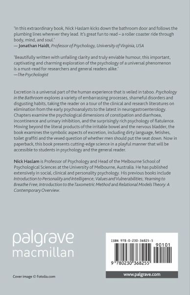"Dr. Haslam should be congratulated for creating a unique compendium of information that is so entrenched in our human behavior but rarely thought about or discussed. Psychology in the Bathroom details a wide range of behaviors that are linked to excretory function. Topics such as the 'anal' personality, latrinalia (toilet graffiti, flatulence, scatologic swearing (potty mouth) and medical conditions like irritable bowel syndrome are well covered with regard to their history, psychology and gender and cultural differences in their societal expression. Some topics, like whether the toilet seat should be up or down is nicely discussed in a balanced attempt to solve a seemingly unsolvable domestic problem. I highly recommend this book to psychologists, health care professionals and anyone else interested in understanding such difficult to obtain areas of knowledge." - Douglas A Drossman, Professor of Medicine and Psychiatry, University of North Carolina at Chapel Hill, USA and Past President of the American Psychosomatic Society.