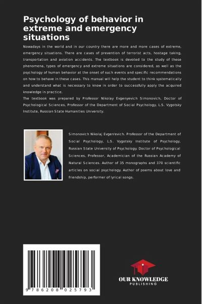 Nowadays in the world and in our country there are more and more cases of extreme, emergency situations. There are cases of prevention of terrorist acts, hostage taking, transportation and aviation accidents. The textbook is devoted to the study of these phenomena, types of emergency and extreme situations are considered, as well as the psychology of human behavior at the onset of such events and specific recommendations on how to behave in these cases. This manual will help the student to think systematically and understand what is necessary to know in order to successfully apply the acquired knowledge in practice.The textbook was prepared by Professor Nikolay Evgenyevich Simonovich, Doctor of Psychological Sciences, Professor of the Department of Social Psychology, L.S. Vygotsky Institute, Russian State Humanities University.