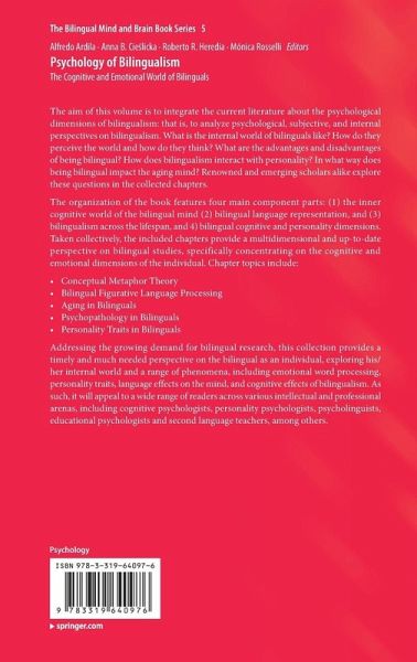 The organization of the book features four main component parts: (1) the inner cognitive world of the bilingual mind (2) bilingual language representation, and (3) bilingualism across the lifespan, and 4) bilingual cognitive and personality dimensions. Taken collectively, the included chapters provide a multidimensional and up-to-date perspective on bilingual studies, specifically concentrating on the cognitive andemotional dimensions of the individual. Chapter topics include:
