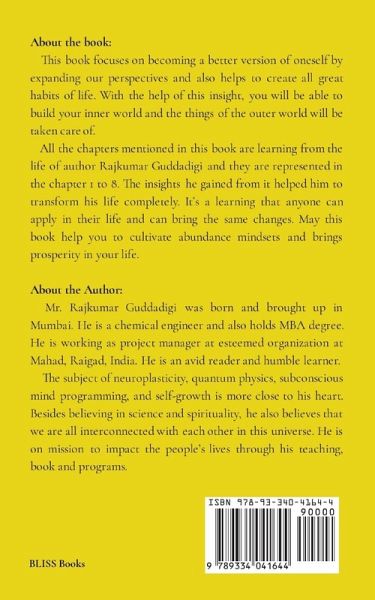 This book focuses on becoming a better version of oneself by expanding our perspectives and also helps to create all great habits of life. With the help of this insight, you will be able to build your inner world and the things of the outer world will be taken care of. All the chapters mentioned in this book are learning from the life of author Rajkumar Guddadigi and they are represented in the chapter 1 to 8. The insights he gained from it helped him to transform his life completely. It's a learning that anyone can apply in their life and can bring the same changes. The book mainly discusses on the following topics: Chapter 1: Every Thought has Purpose Chapter 2: Energy in Motion is called Emotion Chapter 3: The Power of Self-image and Identity Chapter 4: Shift the Mindset by Using Belief System Chapter 5: Journaling: A Hacking Tool to Enter into the Brain Chapter 6: Why Habits and Consistency are called Secret Ingredients Chapter 7: Daily Rituals to Strengthen Your Roots Chapter 8: How Law of Karma Helps you to Live a Better Life May the insight of this book help you to cultivate abundance mindsets and brings prosperity in your life.