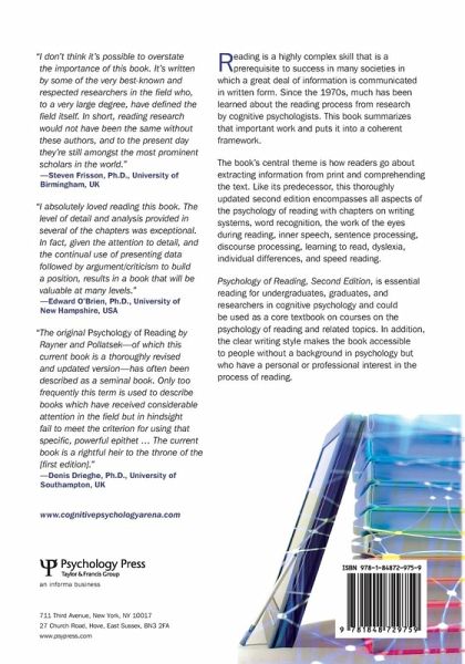 Psychology of Reading, 2nd Edition, is essential reading for undergraduates, graduates, and researchers in cognitive psychology and could be used as a core textbook on courses on the psychology of reading and related topics. In addition, the clear writing style makes the book accessible to people without a background in psychology but who have a personal or professional interest in the process of reading.