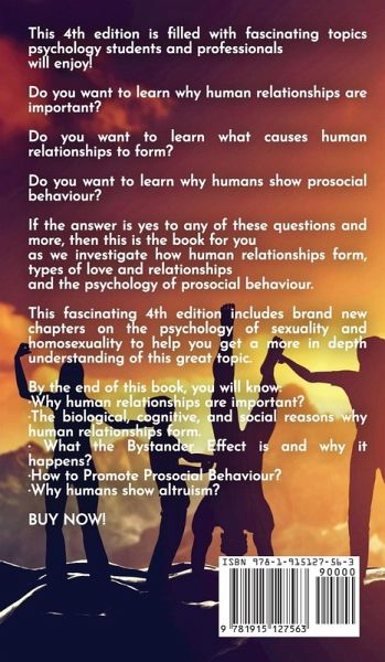 This 4th edition is filled with fascinating topics psychology students and professionals will enjoy! Do you want to learn why human relationships are important? Do you want to learn what causes human relationships to form? Do you want to learn why humans show prosocial behaviour? If the answer is yes to any of these questions and more, then this is the book for you as we investigate how human relationships form, types of love and relationships and the psychology of prosocial behaviour. This fascinating 4th edition includes brand new chapters on the psychology of sexuality and homosexuality to help you get a more in depth understanding of this great topic. By the end of this book, you will know: · Why human relationships are important? · The biological, cognitive, and social reasons why human relationships form. · What the Bystander Effect is and why it happens? · How to Promote Prosocial Behavior? · Why humans show altruism? BUY NOW! Psychology of Human Relationships Content: Introduction Why Are Relationships Important? Part One: What Causes Relationships? The Biological Explanations for Relationships The Cognitive Explanations for Relationships The Social Explanations for Relationships Part Two: Communication, Attraction and Relationship Breakdown Communication Types of Love and Theories of Attraction Maintaining Relationships Why Relationships Change and End? Sexuality Homosexuality Part Three: Prosocial Behaviour Bystanderism Why People Don't Help? Altruism Parochial Altruism Social Identification and the Dark Side of Altruism Promoting Prosocial Behaviour