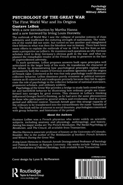 The Psychology of the Great War provides a bridge to study both crowd behavior and battlefield behavior by illustrating how ordinary people are transformed into savages by great events. This element in LeBon's thinking influenced Georges Sorel's thinking, as he had seen the same phenomenon in those who participated in general strikes and revolutions. And in a later period and different context, Hannah Arendt gave this strange capacity of the ordinary to be transformed into the extraordinary the name "banality of evil." The book will be of interest to social theorists, psychologists concerned with group behavior, and historians of the period.