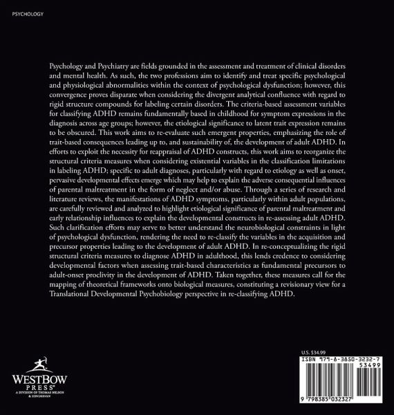 Psychology and Psychiatry are fields grounded in the assessment and treatment of clinical disorders and mental health. As such, the two professions aim to identify and treat specific psychological and physiological abnormalities within the context of psychological dysfunction; however, this convergence proves disparate when considering the divergent analytical confluence with regard to rigid structure compounds for labeling certain disorders. The criteria-based assessment variables for classifying ADHD remains fundamentally based in childhood for symptom expressions in the diagnosis across age groups; however, the etiological significance to latent trait expression remains to be obscured. This work aims to re-evaluate such emergent properties, emphasizing the role of trait-based consequences leading up to, and sustainability of, the development of adult ADHD. In efforts to exploit the necessity for reappraisal of ADHD constructs, this work aims to reorganize the structural criteria measures when considering existential variables in the classification limitations in labeling ADHD; specific to adult diagnoses, particularly with regard to etiology as well as onset, pervasive developmental effects emerge which may help to explain the adverse consequential influences of parental maltreatment in the form of neglect and/or abuse. Through a series of research and literature reviews, the manifestations of ADHD symptoms, particularly within adult populations, are carefully reviewed and analyzed to highlight etiological significance of parental maltreatment and early relationship influences to explain the developmental constructs in re-assessing adult ADHD. Such clarification efforts may serve to better understand the neurobiological constraints in light of psychological dysfunction, rendering the need to re-classify the variables in the acquisition and precursor properties leading to the development of adult ADHD. In re-conceptualizing the rigid structural criteria measures to diagnose ADHD in adulthood, this lends credence to considering developmental factors when assessing trait-based characteristics as fundamental precursors to adult-onset proclivity in the development of ADHD. Taken together, these measures call for the mapping of theoretical frameworks onto biological measures, constituting a revisionary view for a Translational Developmental Psychobiology perspective in re-classifying ADHD.
