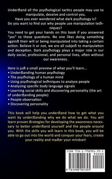 Understand all the psychological tactics people may use to manipulate, deceive and control you. Have you ever wondered what dark psychology is? Do you want to find out why people use manipulation techniques? You need to get your hands on this book if you answered "yes" to these questions. No one likes doing something against their will or being manipulated into taking a certain action. Believe it or not, we are all subject to manipulation and deception. Dark psychology plays a major role in our daily social, professional, and personal lives, often without our awareness. Here is just a small preview of what you'll learn...Understanding human psychology The psychology of a human mind Using psychological techniques to analyze people Analyzing specific body language signals Learning social skills and discovering personality (the art of understanding people) People observation Discovering personality This book will help you understand how to get what you want by understanding why we do what we do. You will learn proven strategies for developing the awareness necessary to better understand yourself and the people around you. With the skills you will learn in this book, you will be able to go out into the world and conquer your fears, create your reality and master your mindset!