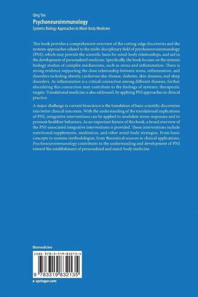 This book provides a comprehensive overview of the cutting-edge discoveries and the systems approaches related to the multi-disciplinary field of psychoneuroimmunology (PNI), which may provide the scientific basis for mind-body relationships, and aid in the development of personalized medicine. Specifically, the book focuses on the systems biology studies of complex mechanisms, such as stress and inflammation. There is strong evidence supporting the close relationship between stress, inflammation, and disorders including obesity, cardiovascular disease, diabetes, skin diseases, and sleep disorders. As inflammation is a critical connection among different diseases, further elucidating this connection may contribute to the findings of systemic therapeutic targets. Translational medicine is also addressed, by applying PNI approaches in clinical practice. A major challenge in current bioscience is the translation of basic scientific discoveries into better clinical outcomes. With theunderstanding of the translational implications of PNI, integrative interventions can be applied to modulate stress responses and to promote healthier behaviors. As an important feature of this book, a broad overview of the PNI-associated integrative interventions is provided. These interventions include nutritional supplements, meditation, and other mind-body strategies. From basic concepts to systems methodologies, from theoretical sources to clinical applications, Psychoneuroimmunology contributes to the understanding and development of PNI toward the establishment of personalized and mind-body medicine.
