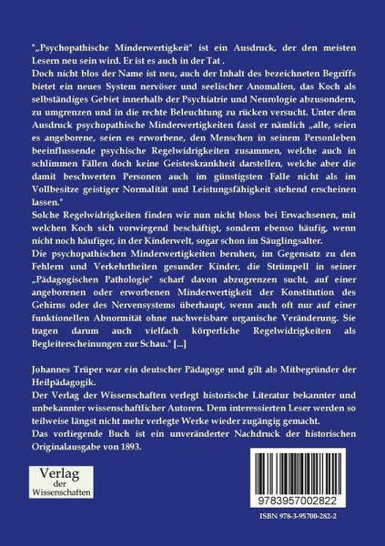 Die psychopathischen Minderwertigkeiten beruhen, im Gegensatz zu den Fehlern und Verkehrtheiten gesunder Kinder, die Strümpell in seiner Pädagogischen Pathologie" scharf davon abzugrenzen sucht, auf einer angeborenen oder erworbenen Minderwertigkeit der Konstitution des Gehirns oder des Nervensystems überhaupt, wenn auch oft nur auf einer funktionellen Abnormität ohne nachweisbare organische Veränderung. Sie tragen darum auch vielfach körperliche Regelwidrigkeiten als Begleiterscheinungen zur Schau." [...]