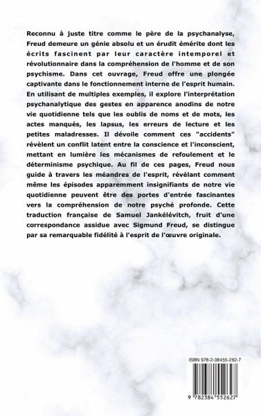 Reconnu à juste titre comme le père de la psychanalyse, Freud demeure un génie absolu et un érudit émérite dont les écrits fascinent par leur caractère intemporel et révolutionnaire dans la compréhension de l'homme et de son psychisme. Dans cet ouvrage, Freud offre une plongée captivante dans le fonctionnement interne de l'esprit humain. En utilisant de multiples exemples, il explore l'interprétation psychanalytique des gestes en apparence anodins de notre vie quotidienne tels que les oublis de noms et de mots, les actes manqués, les lapsus, les erreurs de lecture et les petites maladresses. Il dévoile comment ces "accidents" révèlent un conflit latent entre la conscience et l'inconscient, mettant en lumière les mécanismes de refoulement et le déterminisme psychique. Au fil de ces pages, Freud nous guide à travers les méandres de l'esprit, révélant comment même les épisodes apparemment insignifiants de notre vie quotidienne peuvent être des portes d'entrée fascinantes vers la compréhension de notre psyché profonde. Cette traduction française de Samuel Jankélévitch, fruit d'une correspondance assidue avec Sigmund Freud, se distingue par sa remarquable fidélité à l'esprit de l'uvre originale. Extrait : certaines insuffisances de notre fonctionnement psychique (insuffisances dont le caractère général sera défini avec plus de précision tout à l'heure) et certains actes en apparence non intentionnels se révèlent, lorsqu'on les livre à l'examen psychanalytique, comme parfaitement motivés et déterminés par des raisons qui échappent à la conscience.