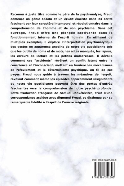Reconnu à juste titre comme le père de la psychanalyse, Freud demeure un génie absolu et un érudit émérite dont les écrits fascinent par leur caractère intemporel et révolutionnaire dans la compréhension de l'homme et de son psychisme. Dans cet ouvrage, Freud offre une plongée captivante dans le fonctionnement interne de l'esprit humain. En utilisant de multiples exemples, il explore l'interprétation psychanalytique des gestes en apparence anodins de notre vie quotidienne tels que les oublis de noms et de mots, les actes manqués, les lapsus, les erreurs de lecture et les petites maladresses. Il dévoile comment ces "accidents" révèlent un conflit latent entre la conscience et l'inconscient, mettant en lumière les mécanismes de refoulement et le déterminisme psychique. Au fil de ces pages, Freud nous guide à travers les méandres de l'esprit, révélant comment même les épisodes apparemment insignifiants de notre vie quotidienne peuvent être des portes d'entrée fascinantes vers la compréhension de notre psyché profonde. Cette traduction française de Samuel Jankélévitch, fruit d'une correspondance assidue avec Sigmund Freud, se distingue par sa remarquable fidélité à l'esprit de l'uvre originale. Extrait : certaines insuffisances de notre fonctionnement psychique (insuffisances dont le caractère général sera défini avec plus de précision tout à l'heure) et certains actes en apparence non intentionnels se révèlent, lorsqu'on les livre à l'examen psychanalytique, comme parfaitement motivés et déterminés par des raisons qui échappent à la conscience.