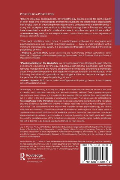 This text provides students and professionals with the knowledge they need to treat work-related psychopathology and contribute to this new and growing aspect of clinical practice.