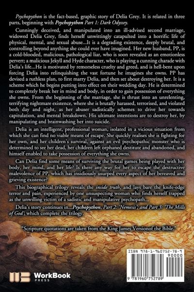 PSYCHOPYTHON is the fact-based, graphic story of Delia Grey. It is related in three parts; beginning with Part 1, "Dark Odyssey." Cunningly manipulated into an ill-advised second marriage, widowed Delia Grey, finds herself unwittingly catapulted into a horrific life of physical, mental, and sexual abuse, terrible beyond anything she could ever have imagined. Her new husband is a cold-blooded, calculating, Jekyll and Hyde character; a psychopython, motivated by emotionless cruelty and greed, and with the determination to force Delia into relinquishing the vast fortune he imagines she owns. He has devised a ruthless plan to destroy her, which he begins putting into effect on their wedding day. He has every intention of coercing and crushing her, in mind and body, in order to take possession of everything she has. From the beginning of the marriage, Delia is thrust into a nightmare existence, as she is relentlessly driven, by day and night, towards capitulation and suicide. Delia is an intelligent, and resourceful, professional woman, who is suddenly isolated in a vicious situation from which she can find no way of escape. She quickly realises she is fighting for her own, and her children's survival, against a remorseless psychopath who is determined to destroy her. Can Delia survive the malevolent games being played with her mind and her life? Is there any way for her to escape the destructive evil that has permeated every aspect of her existence? PSYCHOPYTHON, Part 2, "Nemesis", is followed by the concluding sequel to Delia's story which will be "Mills of God."