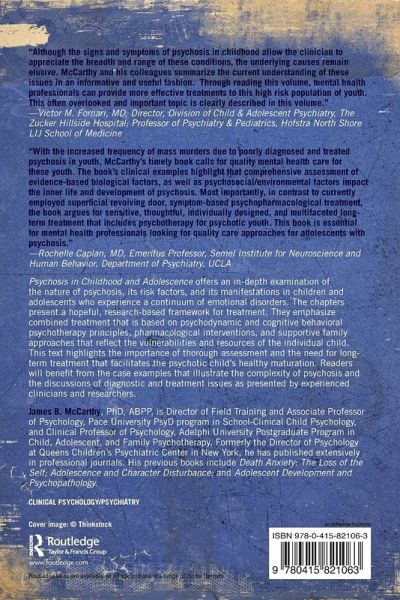 "McCarthy presents an impressive and important comprehensive review of diagnostic conceptualizations and treatment of psychosis in children with particular attention to controversial and complex issues encountered by clinicians. The integration of clearly presented theoretical underpinnings with an examination of current research advances the reader's understanding and treatment of psychosis. This book is an invaluable text and resource for students and seasoned practitioners alike." -Francine Conway, PhD, Professor and Chair, Derner Institute for Advanced Psychological Studies, Adelphi University