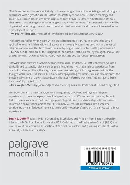 This book presents a new paradigm for distinguishing psychotic and mystical religious experiences. In order to explore how Presbyterian pastors differentiate such events, Susan L. DeHoff draws from Reformed theology, psychological theory, and robust qualitative research. Following a conversation among multidisciplinary voices, she presents a new paradigm considering the similarities, differences, and possible overlap of psychotic and mystical religious experiences.