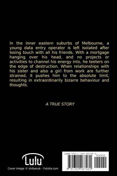 In the inner eastern suburbs of Melbourne, a young data entry operator is left isolated after losing touch with all his friends. With a mortgage hanging over his head, and no projects or activities to channel his energy into, he teeters on the edge of destruction. When relationships with his sister and also a girl from work are further strained, it pushes him to the absolute limit, resulting in extraordinarily bizarre behaviour and thoughts. A TRUE STORY