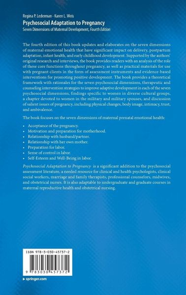 Psychosocial Adaptation to Pregnancy is a significant addition to the psychosocial assessment literature, a needed resource for clinical and health psychologists, clinical social workers, marriage and family therapists, professional counselors, midwives, and obstetrical nurses. It is also adaptable to undergraduate and graduate courses in maternal reproductive health and obstetrical nursing.