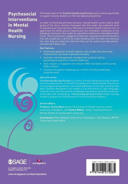 In order to give high quality care it is essential that mental health nurses have a solid grasp of the most common therapies and interventions used in mental healthcare. If nurses understand what the various interventions involve then they will be much better equipped to support patients through their recovery. This is a practical, engaging introduction to the major psychosocial interventions that demonstrates to students what the interventions are, why they are important and how they can be used.