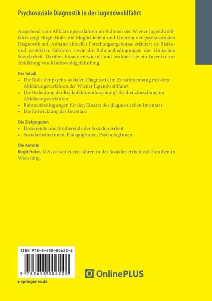 Die Rolle der psycho-sozialen Diagnostik im Zusammenhang mit dem Produkt des Abklärungsverfahrens der Wiener Jugendwohlfahrt.- Theoretische Grundlagen des zu entwickelnden Inventars.- Die Bedeutung der Risikofaktorenforschung/ Resilienzforschung im Abklärungsverfahren.- Rahmenbedingungen für den Einsatz des diagnostischen Inventars.- Forschungsdesign.- Methodik und Vorgehensweise.- Deskriptive Darstellung und Interpretation der Ergebnisse.- Ergebnisse der analytischen Datenanalyse.- Die Entwicklung des Inventars.