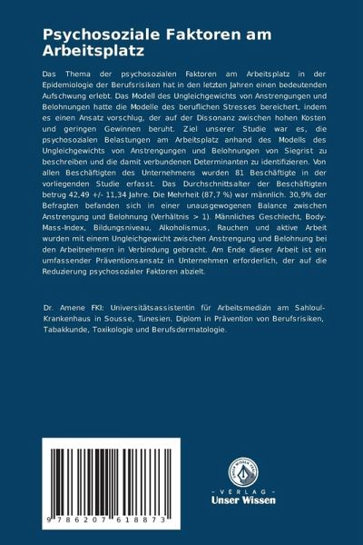 Das Thema der psychosozialen Faktoren am Arbeitsplatz in der Epidemiologie der Berufsrisiken hat in den letzten Jahren einen bedeutenden Aufschwung erlebt. Das Modell des Ungleichgewichts von Anstrengungen und Belohnungen hatte die Modelle des beruflichen Stresses bereichert, indem es einen Ansatz vorschlug, der auf der Dissonanz zwischen hohen Kosten und geringen Gewinnen beruht. Ziel unserer Studie war es, die psychosozialen Belastungen am Arbeitsplatz anhand des Modells des Ungleichgewichts von Anstrengungen und Belohnungen von Siegrist zu beschreiben und die damit verbundenen Determinanten zu identifizieren. Von allen Beschäftigten des Unternehmens wurden 81 Beschäftigte in der vorliegenden Studie erfasst. Das Durchschnittsalter der Beschäftigten betrug 42,49 +/- 11,34 Jahre. Die Mehrheit (87,7 %) war männlich. 30,9% der Befragten befanden sich in einer unausgewogenen Balance zwischen Anstrengung und Belohnung (Verhältnis > 1). Männliches Geschlecht, Body-Mass-Index, Bildungsniveau, Alkoholismus, Rauchen und aktive Arbeit wurden mit einem Ungleichgewicht zwischen Anstrengung und Belohnung bei den Arbeitnehmern in Verbindung gebracht. Am Ende dieser Arbeit ist ein umfassender Präventionsansatz in Unternehmen erforderlich, der auf die Reduzierung psychosozialer Faktoren abzielt.