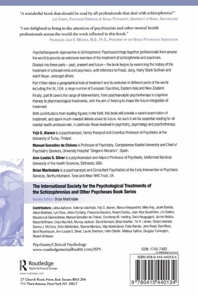 Part I: The Past: Early History of the Treatment of Schizophrenic Psychoses and the Pioneers of the Psychotherapeutic Approach. Alanen Can We Approach Schizophrenic Patients from a Psychological Basis? Chávez Treatment of Psychoses Before the Twentieth Century. Alanen The Schreber Case and Freud's Double-edged Influence on the Psychoanalytic Approach to Psychosis. Hoffmann The Burghölzli School: Bleuler Jung Spielrein Binswanger and Others. Alanen The Pioneering Work of Paul Federn. Silver Pioneers of the Psychoanalytically Oriented Treatment of Psychosis in the USA. Part II: From Past to Present: World Developments from the 1940s to the Present. United States of America. Silver Stedman Psychodynamic Developments 1940s to the Present. Great Britain. Jackson The Contribution of Kleinian Innovations to the Treatment of Psychotic Patients. Kennard Psychological Therapies for Schizophrenic Psychoses in the UK. German-speaking Central Europe. Hoffmann The Development of Psychosis Psychotherapy in Switzerland. Mentzos The Development of Psychosis Psychotherapy in Germany and Austria. France. Gaudilliére Davoine The Contribution of Some French Psychoanalysts to the Clinical and Theoretical Approaches to Transference in the Psychodynamic Treatment of Psychosis. Italy. Alessandrini Di Giannantonio The Psychiatric Care Reform Bill and Development of Psychotherapeutic Approaches. Northern Europe. Aaltonen Alanen Cullberg Haugsgjerd Levander Rosenbaum Developments in the Scandinavian Countries. Levander Cullberg Sweden: From Bjerre to the Parachute Project. Haugsgjerd Norway: Wards for Intensive Psychotherapy. Rosenbaum Denmark: Progress by Means of Project Work. Aaltonen Alanen Finland: Continuous Efforts to a Shared Space of Understanding. Eastern Europe. Bomba Did the Iron Curtain Influence the Use of Psychotherapy in the Treatment of People Diagnosed as Having Schizophrenic Disorder? Eastern Asia. Chua Developments in Eastern Asia: A Focus on Singapore. Huh Taopsychotherapy in Korea. New Zealand: Geekie Taitimu Rook Ang Read A History of Treatment Approaches to Psychosis. Part III: From Present to Future: Different Modalities of Treatment and Interventions. Koehler Silver Psychodynamic Treatment of Psychosis in the USA: Promoting Development Beyond Biological Reductionism. Stierlin The Family in Schizophrenic Disorder: Systemic Approaches. Chávez Group Psychotherapy and Schizophrenia. Dudley Brabban Turkington Cognitive Behavioural Therapy for Psychosis. Hietala Psychopharmacological Treatment and Psychotherapy in Schizophrenic Psychoses. Räkköläinen Aaltonen The Principles of Using and Not-using Neuroleptics in the Finnish Need-adapted Approach to the Treatment of Schizophrenic Psychoses. Larsen Prevention and Early Intervention in Psychosis. Harding McCrory Psychotherapy and Rehabilitation: A Comparison Between Psychotherapeutic Approaches and Psychiatric Rehabilitation for Persons with Serious and Persistent Mental Illness. Aderhold Soteria: A Treatment Model and a Reform Movement in Psychiatry. Whitaker Deinstitutionalization and Neuroleptics: The Myth and the Reality. Alanen Chávez Silver Martindale Further Development of Treatment Approaches to Schizophrenic Psychoses: An Integrated View.