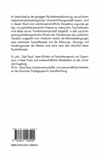Im Unterschied zu der gängigen Psychotherapieforschung, die auf einem medizinisch-pharmakologischen Ursache-Wirkungsmodell basiert, wird in diesem Band eine sozialwissenschaftliche Perspektive zugrunde gelegt, um psychotherapeutische Prozesse zu untersuchen. Psychotherapie wird dabei als ein Transformationsprozeß aufgefaßt, in dem psychologisch-psychotherapeutisches Wissen den Erfordernissen des praktischen Handelns angepaßt wird. Analysiert werden die Rahmenbedingungen einer stationären Psychotherapie und die Erfahrungs-, Deutungs- und Handlungsmuster der Klienten zwei Jahre nach dem Abschluß dieser Psychotherapie.