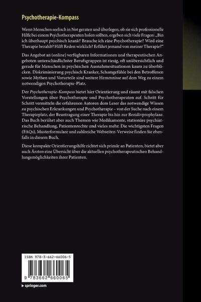 Der ¿Psychotherapie-Kompass¿ bietet Orientierung und räumt mit falschen Vorstellungen über Psychotherapie und Psychotherapeuten auf. Schritt für Schritt vermitteln die erfahrenen Autoren dem Leser das notwendige Wissen zu psychischen Erkrankungen und Psychotherapie ¿ von der Suche nach einem Therapieplatz, der Beantragung einer Therapie bis hin zur Rezidivprophylaxe. Das Buch berührt aber auch Themen wie Medikamente, stationäre psychiatrische Behandlung, Patientenrechte und vieles mehr. Die wichtigsten Musterformulare, Fragen und zahlreiche Webseiten-Verweise finden Sie ebenfalls in diesem Buch.