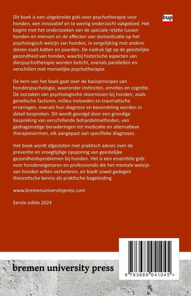 Dit boek is een uitgebreide gids voor psychotherapie voor honden, een innovatief en te weinig onderzocht vakgebied. Het begint met het onderzoeken van de speciale relatie tussen honden en mensen en de effecten van domesticatie op het psychologisch welzijn van honden, in vergelijking met andere dieren zoals katten en paarden. De nadruk ligt op de geestelijke gezondheid van honden, waarbij historische aspecten van dierpsychotherapie worden belicht, evenals parallellen en verschillen met menselijke psychotherapie. De kern van het boek gaat over de basisprincipes van hondenpsychologie, waaronder instincten, emoties en cognitie. De oorzaken van psychologische stoornissen bij honden, zoals genetische factoren, milieu-invloeden en traumatische ervaringen, evenals hun diagnose en beoordeling worden in detail besproken. Dit wordt gevolgd door een grondige bespreking van verschillende behandelmethoden, van gedragsmatige benaderingen tot medicatie en alternatieve therapievormen, elk aangepast aan specifieke diagnoses. Het boek wordt afgesloten met praktisch advies over de preventie en vroegtijdige opsporing van geestelijke gezondheidsproblemen bij honden. Het is een essentiële gids voor hondeneigenaren en professionals die het mentale welzijn van honden willen verbeteren, en biedt zowel gedegen theoretische kennis als praktische begeleiding.