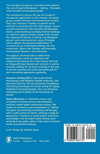 This thought-provoking book shows how psychotherapy can be an important and empowering resource for a client group that has frequently been denied such services - mentally handicapped people. The contributors discuss a range of therapeutic approaches, including group analytic therapy and transactional analysis, within this context. They also examine specific issues such as countertransference with mentally handicapped clients, understanding secondary mental handicap as a defence against trauma, group work around the stigmatized identity of being a handicapped person, reminiscence as a way of helping clients address the personal implications of moving from an institutional setting `into the community¿ and work with families with mentally handicapped children.