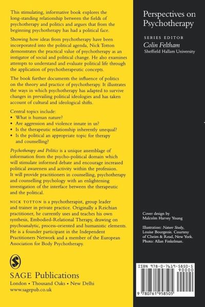 `This book bristles with challenges, is richly referenced, rigorously and compellingly argued. Its interest for student counsellors is in helping us to understand the politics of our own positions, both institutional and ideological' - Counselling and Psychotherapy Journal `This stimulating addition to SAGE's catalogues aims to give the practisng counsellor/therapist a multi-dimensional overview of the various ways in which the political and psychotherapeutic worlds interface' - Association for University and College Counselling Newsletter `This is a truly outstanding book. In a world riven with anger, hatred, fear and aggression it provides a window of rationality, inspired by intelligence, understanding and humanistic principles' - The Journal of Critical Psychology, Counselling & Psychotherapy `SAGE's invariably stimulating book series 'Perspectives in Psychotherapy', edited by Colin Feltham, is certainly fortunate to be graced by the latest addition from Nick Totton, who offers us a tour de force of the diverse and manifold ways in which therapy and politics interpenetrate and inform each other' - Richard House, Self & Society