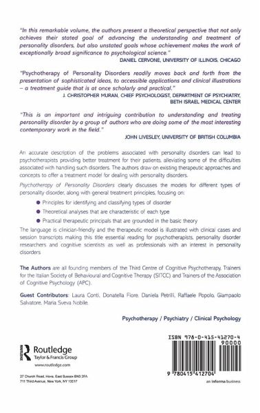 Dimaggio Semerari Carcione Nicolò Procacci The Perpetuation of Personality Disorders: A Model. Semerari Dimaggio Carcione Conti Nicolò General Treatment Principles. Semerari Fiore Borderline Personality Disorder: Model and Treatment. Dimaggio Fiore Salvatore Narcissistic Personality Disorder: Model and Treatment. Carcione Conti Dependent Personality Disorder: Model and Treatment. Procacci Popolo Petrilli Dimaggio Avoidant Personality Disorder: Model and Treatment. Nicolò Nobile Paranoid Personality Disorder: Model and Treatment. Dimaggio Semerari Carcione Nicolò Procacci Conclusions.