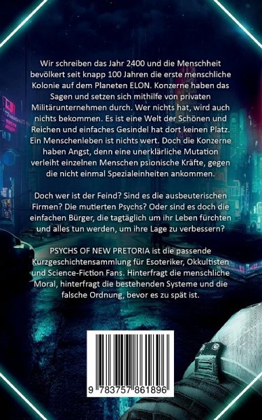 Renn! Sonst kommen sie dich holen ... PSYCHS OF NEW PRETORIA erforscht in fünf Kurzgeschichten die Abgründe der Menschheit. Mit seiner ersten großen Veröffentlichung entführt euch T. W. Scipio in die Welt von PSYCH und präsentiert psychologischen Horror vom Feinsten. Die Kurzgeschichtensammlung umfasst: DIE SCHÖNE UND DER DIEB, NACHTS IN DER BIBLIOTHEK, PSYCH, ANNA und STIMMEN IM KOPF.Wir schreiben das Jahr 2400 und die Menschheit bevölkert seit knapp 100 Jahren die erste menschliche Kolonie auf dem Planeten ELON. Konzerne haben das Sagen und setzen sich mithilfe von privaten Militärunternehmen durch. Wer nichts hat, wird auch nichts bekommen. Es ist eine Welt der Schönen und Reichen und einfaches Gesindel hat dort keinen Platz. Ein Menschenleben ist nichts wert. Doch die Konzerne haben Angst, denn eine unerklärliche Mutation verleiht einzelnen Menschen psionische Kräfte, gegen die nicht einmal Spezialeinheiten ankommen. Doch wer ist der Feind? Sind es die ausbeuterischen Firmen?Die mutierten Psychs? Oder sind es doch die einfachen Bürger, die tagtäglich um ihr Leben fürchten und alles tun werden, um ihre Lage zu verbessern?PSYCHS OF NEW PRETORIA ist die passende Kurzgeschichtensammlung für Esoteriker, Okkultisten und Science-Fiction Fans. Hinterfragt die menschliche Moral, hinterfragt die bestehenden Systeme und die falsche Ordnung, bevor es zu spät ist.Die Kurzgeschichtensammlung begleitet eine Vielzahl an unterschiedlichen Personen. Wo sonst findet man einen Junkie, der vor dem Gesetz flieht und die Liebe seines Lebens trifft? Wo sonst wütet eine soziopathische Mörderin in einer Schule? Trefft einen Kommissar, dessen Moral und Prinzipien durch einen PSYCH auf den Kopf gestellt wird. Lernt Anna, die Tochter reicher Unternehmer, kennen. Oder fiebert beim Einsatz des gefürchteten Infiltrationskommandos mit.Taucht ein in eine Welt voller Psychopathen, Egoisten und Mördern.PSYCHS OF NEW PRETORIA ist die perfekte Einführung in das PSYCH-Universum von T. W. Scipio. Es verfolgt keine Helden, keine Ritter in weißer Rüstung. Die Geschichten konfrontieren auch den gutgläubigsten Menschen mit der bitteren Realität unserer Zeit. Ihr glaubt, die Szenerien und Vorstellungen sind frei erfunden? Dann schaut doch mal in unsere Welt, schaut euch das wahre Leben an und lasst die gruseligen Kurzgeschichten auf euch wirken.Die Realität holt uns alle ein.