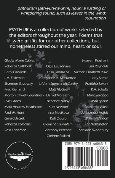 psithurism [sith-yuh-riz-uhm] noun: a rustling or whispering sound, such as leaves in the wind; susurration Psythur is a collections of works selected by the editors throughout the year. Poems that were misfits for our other collections, but nonetheless stirred our mind, heart, or soul. Featuring: Aleksandra Vujisi¿ Anthony Perconti Bernardo Villela Carol Edwards Catherine A. MacKenzie Clement Oluwafemi Corinne Pollard Daniel Moreschi Evie Groch Fred Gerhard Gerald Jatzek Gladys Marie Cubias Indy Samra Irina Novikova K.A. Schultz Keri Withington Kofi Oduro Kurt Newton L.A. Felleman LaVern Spencer McCarthy Leila Sandra M. Linda Sparks Lisa Reynolds Marc Sorondo Mark Andrew Heathcote Matt McGee Morton Otwell Gourdneck Olga Levadnaya Paul W. Hunt Pratibha Savani Rebecca Cuthbert Rebecca Köodziej Ross Leishman Sharmon Gazaway Sheldon Woodbury Swayam Prashant Theodore Ndlovu Victoria Elizabeth Ruwi William Waldorf