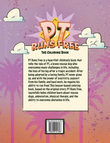 PT Runs Free is a heartfelt children's book that tells the tale of PT, a brave rescue dog who overcomes many challenges in life, including the loss of his leg after a tragic accident. After being adopted by a loving family, PT never gives up, and with the power of positivity, support from his family and hard work, he regains his ability to run free! This coloring/lesson book, based on the original story, PT Runs Free, tastefully helps children learn about rescue dogs, amputation, physical therapy and the ability to overcome obstacles in life. Proceeds from this book will go to Bella's Heart, a 501C3 nonprofit focused on foster and adoption-based rescue. Bella's Heart provides funds for the care of shelter dogs requiring medical attention and covers foster expenses to assist along their journey to a forever home like PT. To learn more, visit: bellasheartrescue.com