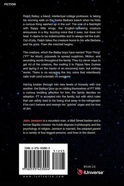 Ralph Bailey, bland, intellectualizing professor, is taking his morning walk on the Santa Barbara beach when he finds a curious thing washed up in the surf. The size of a flashlight, with floppy little wings, the creature announces in a tiny, buzzing voice that it sees, but does not hear. It claims to be indestructible and to always tell the truth. Out of pity, Ralph takes the creature home to his wife Barbara and his sons. Then the mischief begins. The creature, which the Bailey boys have named "Poor Thing" (PT for short) proceeds to spread suspicion, friction, and wounding words throughout the family. They try clever ways to get rid of the creature, like mailing it to Papua New Guinea and laying it on the tracks of an oncoming train, but nothing works. There is no escaping the tiny voice that relentlessly calls truth (and scandal) on everyone. Having broken through into new levels of honesty with one another, the Baileys give up on ridding themselves of PT. With a curious budding affection for it, the family decides on adoption. PT is accepted into the family, but with strict rules that can easily lead to his being shut away in the refrigerator if he can't behave and restrain his "gotcha" urges and his love of dirt.
